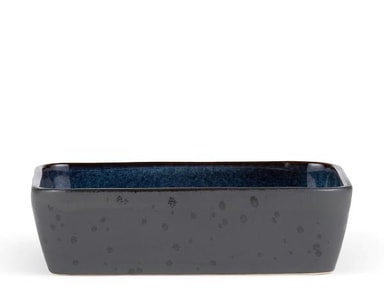 Bitz rektangulære fat i matt, svart steintøy med blank mørkeblå glasur på innsiden, måler 17 x 30 cm og er 8 cm høyt. Det flotte fatet er tilgjengelig i to størrelser og flere fantastiske farger, med en unik og reaktiv glasur som fremhever steintøyets glød.