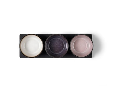 Bitz cabaretsett inneholder et svartbeiset trebrett og tre skåler i steintøy. Kombinasjonen av skålenes utvendige, matte glasur og de tre forskjellige blanke glasurene på innsiden gir et unikt uttrykk, og du finner ikke to like skåler. 10 cm.