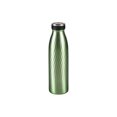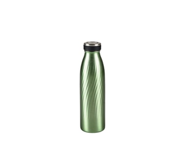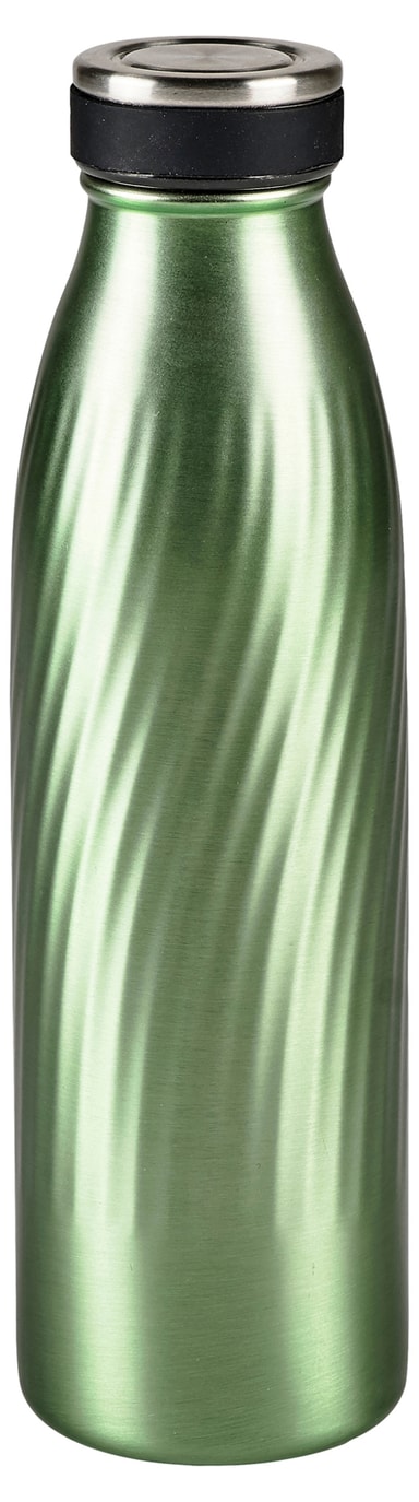 500 ml termos i rustfritt stål, og lokk med svart softtouch-silikon. Grønn metallfinish.Flasken er velegnet til både kald og varm drikke, og den kan med fordel tempereres med kaldt eller varmt vann fra springen før den fylles med ønsket drikke.
