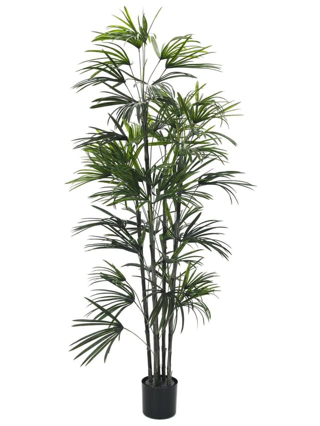 5 stems. made of plastic. suited for outdoor use. in black pot. height: 150 cm. trunk: artificial trunk. positioning: gardening pot. leave color: green.