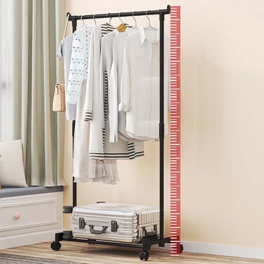 Plassbesparende design: Med sin kompakte størrelse er dette klesstativet perfekt for små rom. Det maksimerer vertikal plass, slik at du kan henge opp mange klær uten å ta opp for mye gulvplass. Den enkle stangen gir tilstrekkelig plass for å henge opp skjorter, bukser og kjoler, mens den nederste hyllen kan brukes til å oppbevare sko, vesker eller andre gjenstander. Dette gjør det til en ideell løsning for de som bor i leiligheter eller sovesaler med begrenset plass.