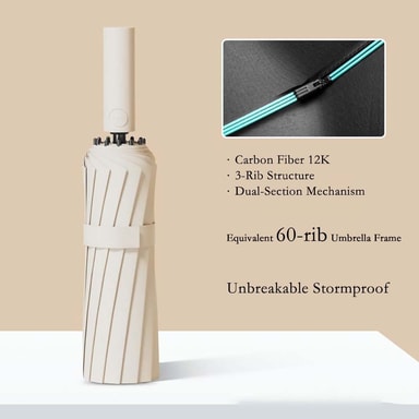Ekstremt vindtett design: Denne fullautomatiske paraplyen er konstruert med 60 ribber (12 ribber x 5 bein) laget av en robust kombinasjon av legering og glassfiber, noe som gir enestående motstand mot kraftig vind og stormvær. Den er designet for å tåle de tøffeste værforholdene, og sikrer at du holder deg tørr og beskyttet selv i sterk vind. Den forsterkede konstruksjonen gir ekstra stabilitet og forhindrer at paraplyen vrenges eller går i stykker, noe som gjør den til et pålitelig valg for daglig bruk og reiser.