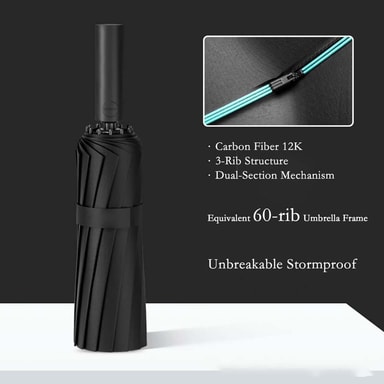 Ekstremt vindtett design: Denne fullautomatiske paraplyen er konstruert med 60 ribber (12 ribber x 5 bein) laget av en robust kombinasjon av legering og glassfiber, noe som gir enestående motstand mot kraftig vind og stormvær. Den er designet for å tåle de tøffeste værforholdene, og sikrer at du holder deg tørr og beskyttet selv i sterk vind. Den forsterkede konstruksjonen gir ekstra stabilitet og forhindrer at paraplyen vrenges eller går i stykker, noe som gjør den til et pålitelig valg for daglig bruk og reiser.