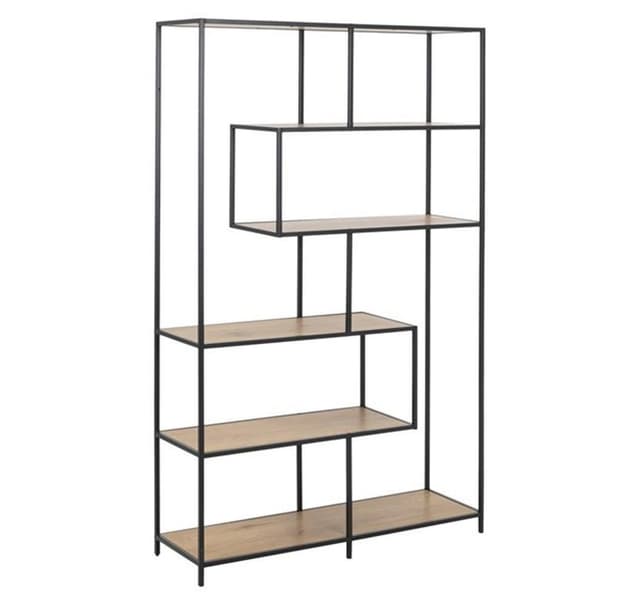 Hylle SEAFORD 114x35xH185cm, eik. Den smakfulle og praktiske hyllen kan brukes i ulike rom for praktisk oppbevaring. Hyllene er laget av laminert sponplate. Fargen er eik. Rammen er laget av sort metall. Dimensjonene på produktet er 114x35xH185cm.