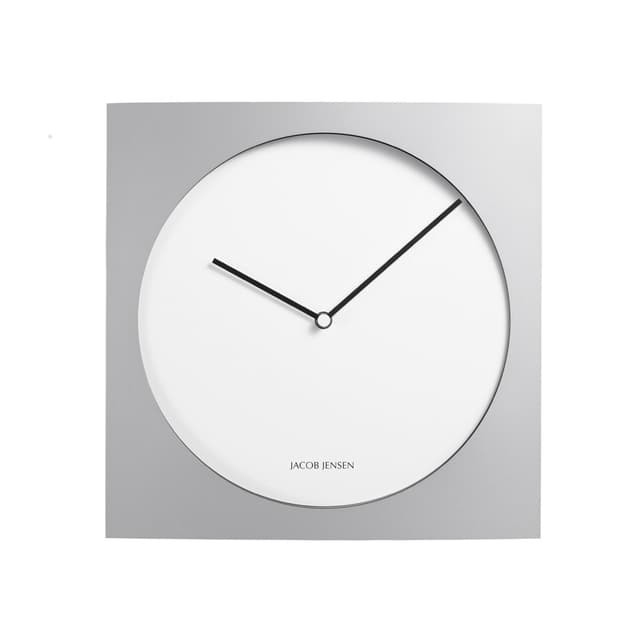 En følelse av renhet gjennomsyrer minimal design av klokken med sitt enkle sirkulære fasett i en elegant firkantet ramme. Klokken har ingen sifre, som gjør at de rene linjene i viserne glir elegant over det tomme lerretet, merker tiden. Klokken har kvartsbevegelse og er laget i aluminium og mdf.
