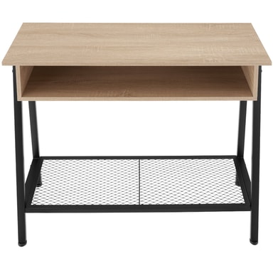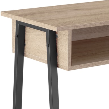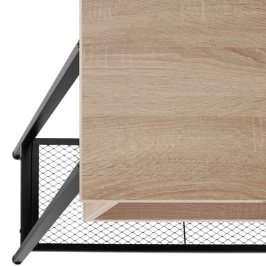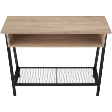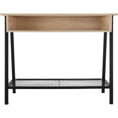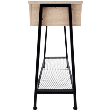 Det minimalistiske Tralee konsollbordet fra tectake, i moderne industriell stil passer inn i enhver innredning. Utover det kantete design gir kombinasjonen av kjølig stål og varmt tre konsollbordet en flott kontrast. Den rustikke gitterhyllen i det nederste området forsterker det fine fabrikklook og gir det lettstelte konsollbordet ennå et nivå i tillegg til det store oppbevaringsområdet og det brede oppbevaringsrommet. En attraktiv detalje er de trapesformede ben som sammen med de høydejusterbare føttene i gulvvennlig plast sikrer bordet en høy stabilitet.