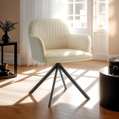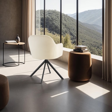 Møbelet imponerer med sitt svært fine fløyelstrekk, som ikke bare er et visuelt høydepunkt, men som i kombinasjon med den store seteskålen og de gjennomgående arm- og ryggstøttene med høydensitets polstring gir en supermyk og behagelig sitteopplevelse. En spesiell egenskap ved denne universelt anvendbare stolen er dens lette, 360° dreiefunksjon, som gjør at du trinnløst kan endre posisjon når som helst.
