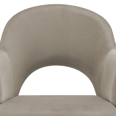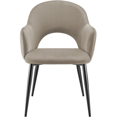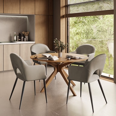 Seteskallene til spisestuestolen imponerer med en elegant kombinasjon av polstrede armlener og en mykt buet ryggstøtte. Kombinasjonen med det fløyelsmyke stoffet gir stolene ikke bare en spesiell eleganse, men også en svært behagelig sitteopplevelse. Ekstra komfort gir den komfortable polstringen med en fylling av høydensitetsskum, som inviterer til lange, koselige timer ved spisebordet.