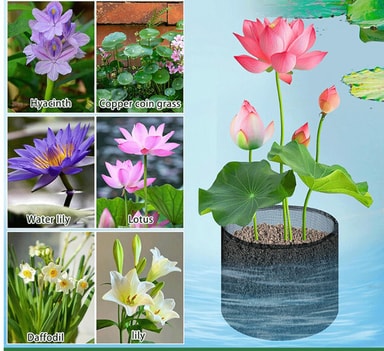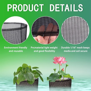 Sett med 4 runde svarte mesh-akvatiske plantepotter. Pustende mesh sikrer optimal vannabsorpsjon og forhindrer jordtap, og opprettholder vannklarheten. Tilpasser seg ujevne overflater, og gir stabilitet for liljer, lotusblomster og andre vannplant...