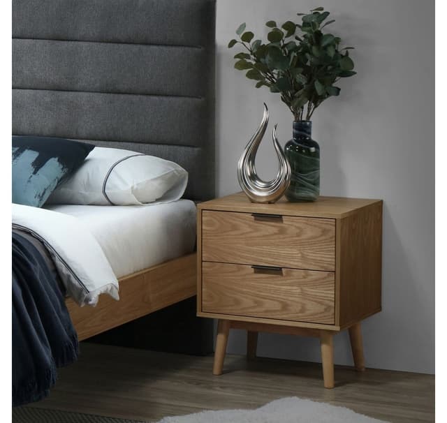 Nattbord ROMAN med 2-skuffer 50x40xH58cm, eik. Nattbordet, laget av møbelplate er dekket med naturlig eikefiner og ferdig med lys lakk. Bena er laget av solid eik.
