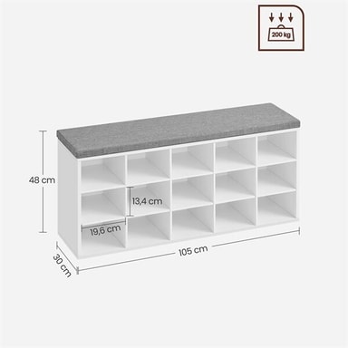 Denne stilige skobenken er den perfekte kombinasjonen av oppbevaring og komfort. Med 15 romslige rom har du god plass til både dame- og herresko, og det polstrede setet i grått gir deg en behagelig sitteplass når du tar på deg skoene. Puten er utstyrt med borrelås, noe som gjør den enkel å ta av ved behov.