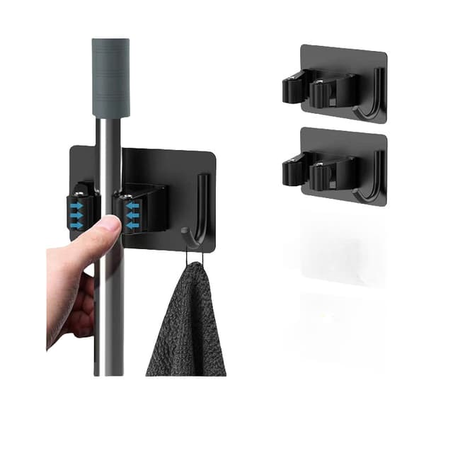 Enkel å installere: Veggmonterte moppekostklipshengere er enkle og praktiske å installere, bare fest på veggen med sterkt selvklebende som holder moppen på plass og beskytter dem mot å falle av.