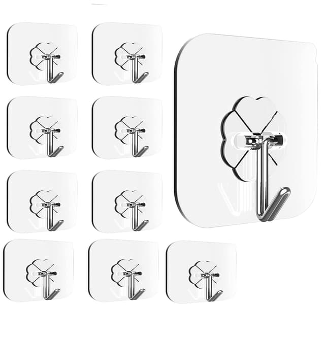 Vannbestandige ""usynlige"" kroker: Veggkrokene er laget av gjennomsiktig plastmateriale og er selvklebende for enkel og fleksibel montering uten behov for boring. Med sitt enkle, stilige design passer de i hele hjemmet, for eksempel som oppheng for håndklær, nøkler eller kjøkkenutstyr.
