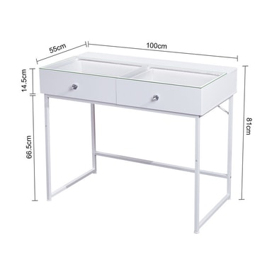 Sminkebord størrelse: 100×55×81 cm. Lagd av høy kvalitet plate + herdet glass, trygt og stabilt med enkle og vakre linjer.