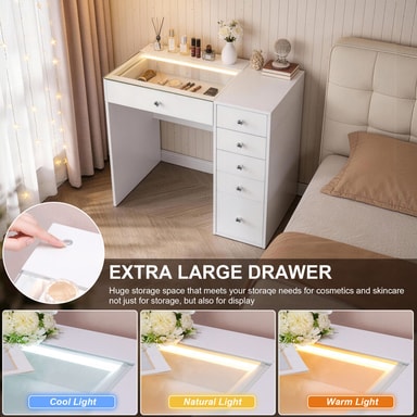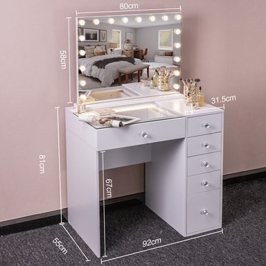 Dette prikkbordet med smart speil måler 92x55x81 cm og har et ergonomisk design. Det er laget av kvalitetsplate og herdet glass, sterkt og holdbart. Med 6 store skuffer gir det rikelig med plass til kosmetikk. Midtskuffen er utstyrt med 3-farget LED-lysstrip for hyggelig atmosfære. Forhåndsborrede deler og trinnvise instruksjoner gjør monteringen enkel, selv for nybegynnere.