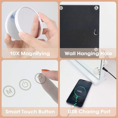 Kommer med 80×58 cm smart speil med 3 fargetemperaturer (kaldt, varmt, naturlig lys), justerbar lysstyrke og gratis 10x forstørrelsesglass.