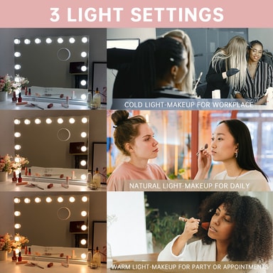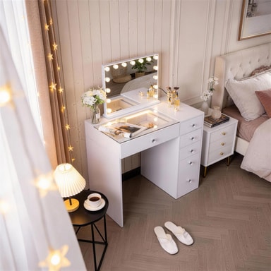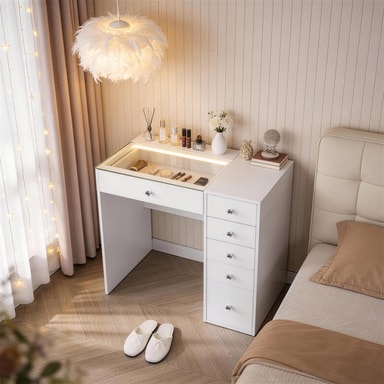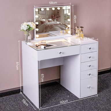 Dette Sminkebord med smart speil har et romelig, elegant og allsidig design – det kan monteres som et sett eller plasseres separat for å lage en personlig layout til forskjellige rom og estetiske preferanser. Med ergonomisk størrelse 92x55x81cm og 6 store skuffer gir det rikelig plass til all kosmetikk. Kombinert med et 58×46cm smart prikkspeil (3 fargetemperaturmoduser, justerbar lysstyrke, gratis 10x forstørrelsesglass inngått) har midtskuffen innebygd 3-farget LED-lysstrip for en hyggelig atmosfære. Forhåndsborrede komponenter og trinnvise instruksjoner gjør monteringen enkel, selv for nybegynnere.
