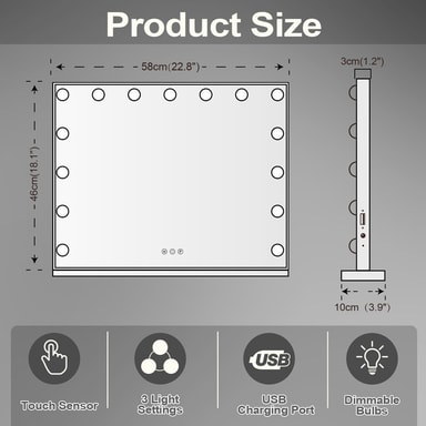 Kombiner med 58×46cm smart prikkspeil (3 fargetemperaturer, justerbar lysstyrke) + gratis 10x forstørrelsesglass inngått.