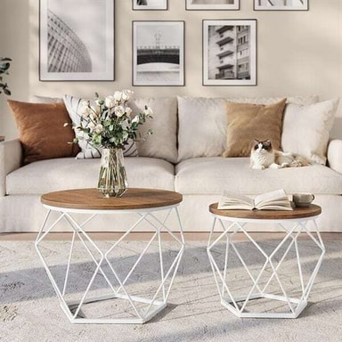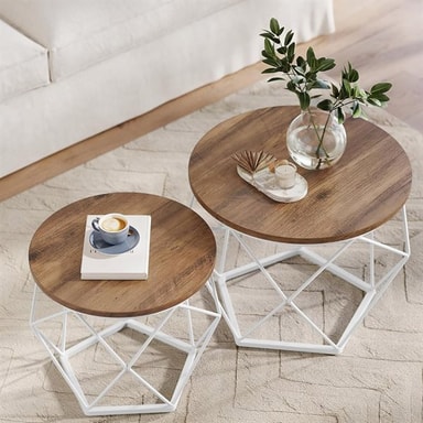 Dette Vasagle-sofabordsettet kombinerer moderne form med praktisk funksjon. Med en varm honningbrun overflate og et stilig, skyhvitt stålunderstell tilfører bordene både eleganse og letthet til stuen. Det runde designet og den kompakte størrelsen gjør dem perfekte selv i mindre rom.