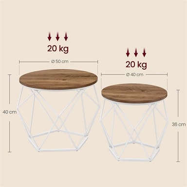 Spesifikasjoner - Mål: Stort bord: 50 x 40 cm, lite bord: 40 x 36 cm - Materiale: Konstruert tre, legert stål - Farge: Honningbrun bordplate, skyhvit ramme - Maks. belastning: 20 kg per bord - Funksjoner: Avtakbar bordplate, rund form, sett med 2, stabil konstruksjon