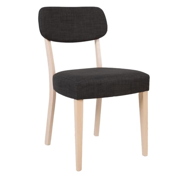 Stol ADORA 49x50xH85,5cm, setehøyde 48,5cm. Polstret sete og rygg dekket med mørkegrått stoff. Ben og ramme er laget av massiv bøk. Tredeler er ferdig med tretone hvit lakk. Maks vektkapasitet 100 kg.