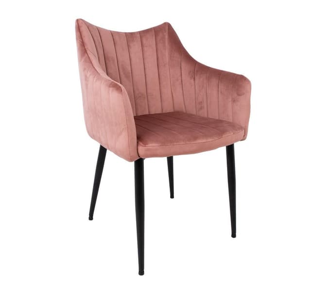 Stol BRETA rosa. Spisestuestolen er praktisk i tillegg til et stilig interiørelement. Det komfortable setet på stolen er polstret. Ryggstøtten og setet er dekket med rosa fløyelsstoff, Martindale 40 000. De pulverlakkerte metallbena er svarte. Rammen er laget av kryssfiner. Setehøyden på stolen er 47,5 cm. Dimensjonene på produktet er 60x58xH88cm. Vektkapasiteten til stolen er 120 kg.