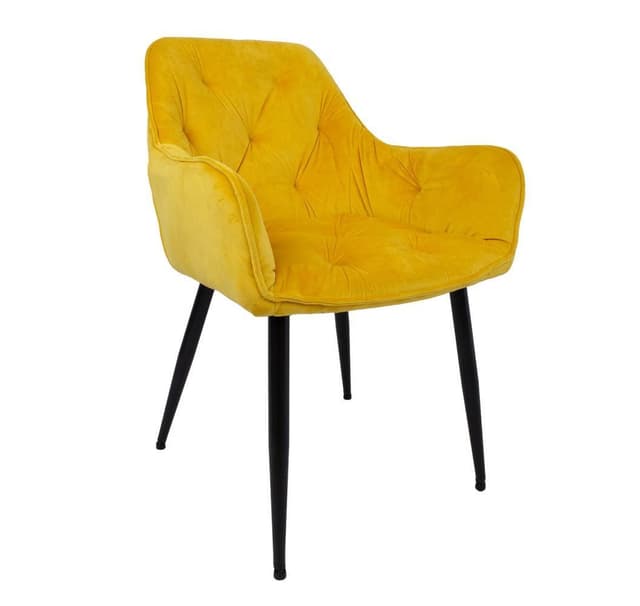 Stol BRITA gul. Det komfortable setet er lett polstret og fullt dekket med gult fløyelsstoff. Setehøyden er 47,5 cm. Trekkmateriale: 100 % polyester, Martindale 25 000. Seteramme: metall og kryssfiner. Polstring: polyuretanskum. Svarte pulverlakkerte metallben. De totale målene på stolen er 58x63H83cm. Setebredde 40cm, setedybde 43cm, setehøyde 47cm. Rygghøyde 43 cm. Vektgrense 120 kg.