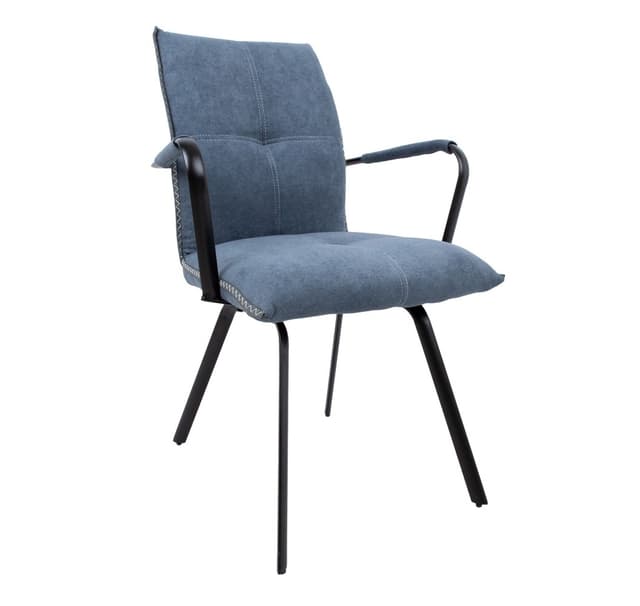 Stol EDDY med armlener 59x56xH89cm, gråblå. Komfortabelt formet sete er lett trukket og dekket med polyesterstoffer. Pulverlakkerte armlener og ben i svart metall. Armlenene har stofftrekk. Setehøyde 48cm, setebredde 47cm, setedybde 45cm. Rygghøyde 47 cm. Høyde på armlenet fra bakken 68cm. Vektgrense 120 kg.