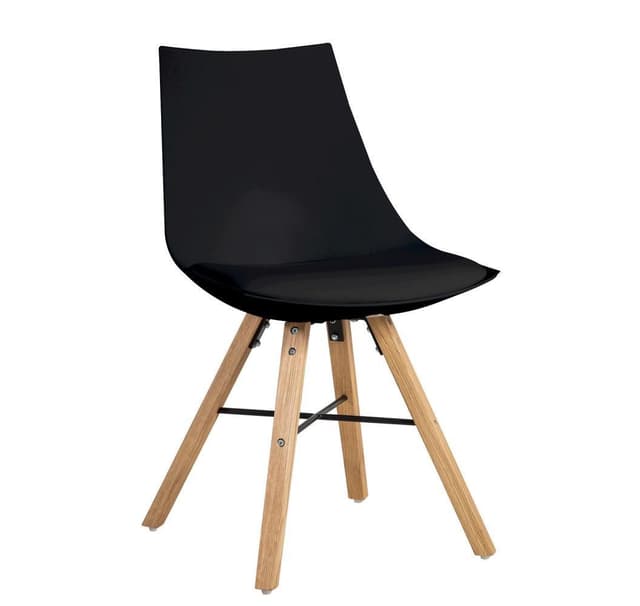 Stol SEIKO. Komfortabelt sete i sort plast. Polstret setebunn er dekket med svart imitert skinn. Ben i lyse eik. Generelle mål 47x55xH80cm. Setehøyde 46cm, setebredde 44cm, setedybde 42cm, rygghøyde 40cm. Maks vektkapasitet 100 kg.