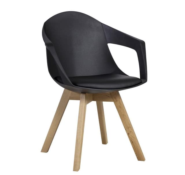 Stol STUART. Stolen har et komfortabelt svart plastsete. Den polstrede setebunnen er dekket med svart imitert skinn. Ben i lyse eik. De generelle målene på stolen er 58x57xH82cm. Setehøyde 42cm, setebredde 40cm, setedybde 45cm. Vektgrense 100 kg.
