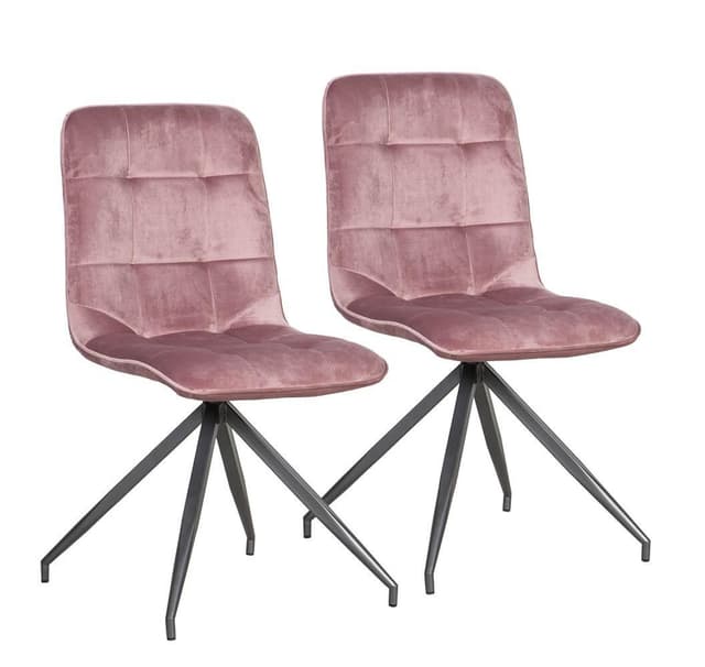 Stoler 2stk RIMINI rosa. Det komfortable plastsetet er lett polstret og fullt dekket med rosa fløyelsstoff. Stolen har 4-bens metallben. Maks vektkapasitet: 100 kg. Dimensjonene på produktet er 48,5x59xH88cm.