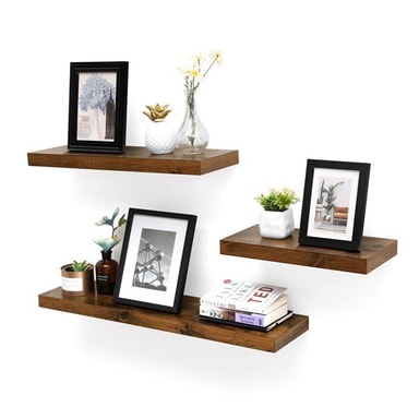 Denne vegghyllen i rustikk brun trefinish gir både funksjon og estetikk til hjemmet ditt. Den stilige designen med skjult montering gir en flytende følelse som gjør at hyllen smelter inn og fremhever det du velger å plassere på den. Enten det er familiebilder, dekorasjoner, bøker eller små potteplanter, får hver gjenstand sin plass.