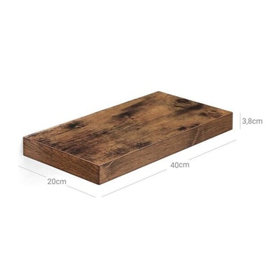 Spesifikasjoner - Mål: 40 x 20 x 3,8 cm (B x D x H) - Materiale: DM-plate (konstruert tre), metall - Farge: Rustikk brun - Maks. belastning: 10-15 kg - Monteringsmetode: Veggmontering med skjult oppheng - Antall hyller: 1 - Stil: Rustikk/vintage - Funksjoner: Slitesterk, flytende design, kompakt format