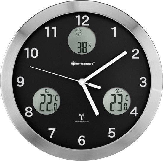 BresserMyTime Amber veggklokke har radiotid igjen. Den viser også innendørs og utendørs temperatur, relativ fuktighet og værmelding. Utendørsradiosenderen muliggjør overføring av utetemperaturen opp til en maksimal rekkevidde på 30 meter