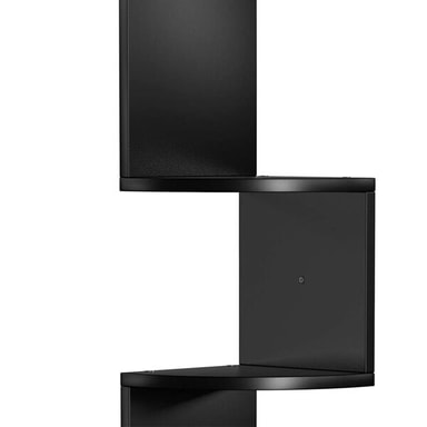 Spesifikasjoner - Mål: 20 x 20 x 126 cm - Materiale: Trefiberplate (MDF) - Antall hyller: 5 - Maks. belastning per hylle: 6 kg - Farge: Svart - Montering: Veggmontering - Design: Zigzag, hjørnemodell