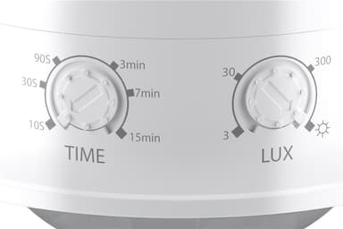Lysfølsomhet (3 lx til 2000 lx) og utkoblingsforsinkelse (10 s til 15 min) kan enkelt stilles inn med en dreiebryter.