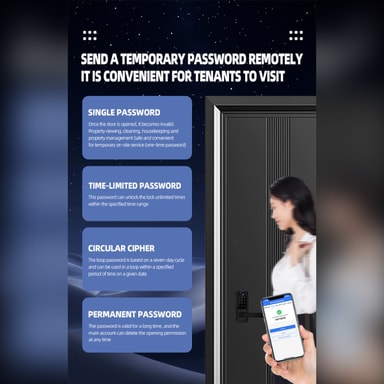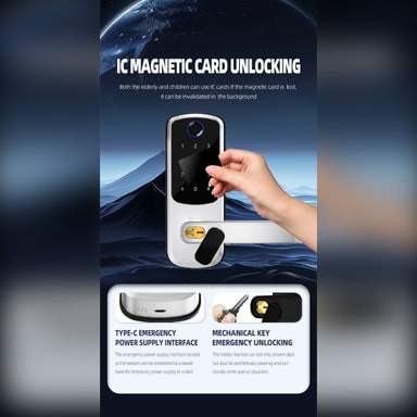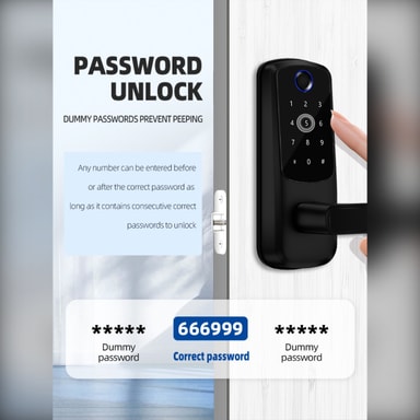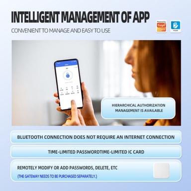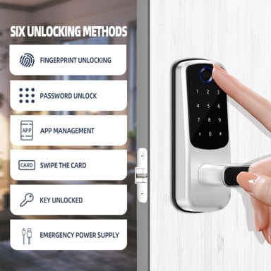 Enhanced Home Security: Oppgrader hjemmesikkerheten din med denne avanserte smarte dørlåsen. Med fingeravtrykkgjenkjenning, passordinntasting og fjernlåsing gir den flere lag med beskyttelse mot uautorisert tilgang. Den biometriske fingeravtrykssensoren sikrer at bare registrerte brukere kan komme inn, mens passordfunksjonen tilbyr et praktisk alternativ. Fjernlåsing lar deg gi tilgang til gjester eller familiemedlemmer selv når du ikke er hjemme, noe som gir trygghet og kontroll over eiendommens sikkerhet. Denne smarte låsen er ideell for hjem, leiligheter og utleieboliger som søker en moderne og pålitelig sikkerhetsløsning.