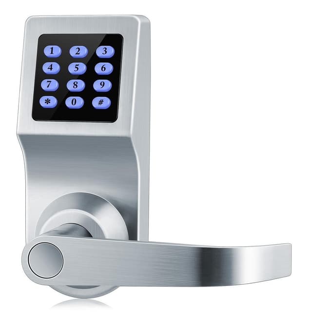 Fire alternativer for opplåsing: Nå kan du låse opp døren med fire forskjellige måter, ikke bare en. Denne multifunksjonelle dørlåsen tilbyr alternativer for opplåsing med RFID -kort (typen som brukes for eksempel på hotellrom), kodelås, fjernkontroll eller en vanlig nøkkel.