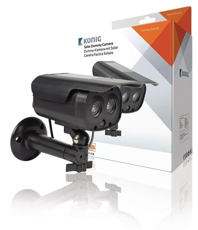 Dette falske utendørskameraet fra König forebygger innbrudd til en brøkdel av prisen av et ekte kamera. Den profesjonelle designen har en blinkende LED, noe som gjør det nesten umulig å skille fra et ekte kamera. Det falske kameraet drives av tre AA-batterier som lades automatisk ved hjelp av et innebygd solcellepanel. Montering er enkelt med de medfølgende skruene.