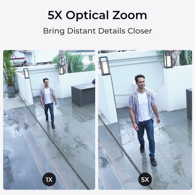 Fang hver detalj i skarp 4K Ultra HD. 8MP-sensoren leverer klare opptak i høy oppløsning, mens 5× optisk zoom lar deg forstørre fjerne områder uten å miste kvalitet, noe som gjør det perfekt for innkjørsler, innganger eller store utendørsområder.