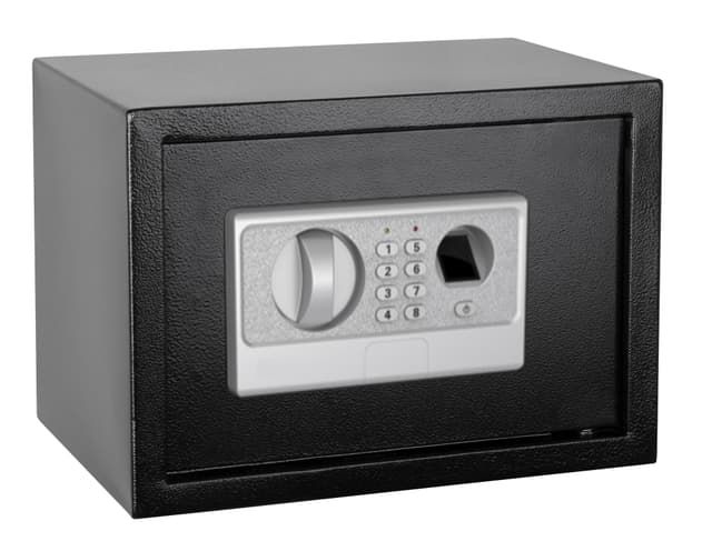 Safe med fingeravtrykkslås Utvendige mål: 250×350×250 mm (h×b×d) Innvendige mål: 245×345×190 mm (h×b×d) Platetykkelse: 2 mm/5 mm (kabinett/dør) Vekt: 10,5 kg LED-display Kode: 4-8 siffer Automatisk lys ved åpning av dør Minne for 20 fingeravtrykk Nø