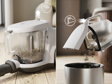 Den mest rotete delen av støvsugingen ble nettopp enklere og renere. Bare tøm støvkammeret med én hånd, designet for problemfri avhending og minimal kontakt med støv fra start til slutt.