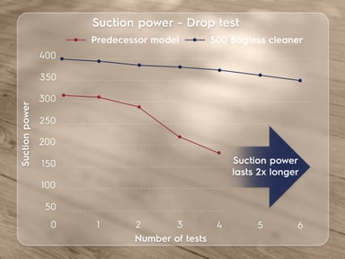 Syklonseparatoren reduserer avbrudd forårsaket av tilstopping, samtidig som det store støvkammeret er enkelt å tømme og lar deg bruke 500 Bagless-støvsugeren lenger mellom turene til søppelbøtta.