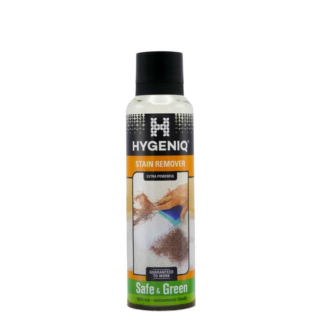 Hygeniq flekkfjerner 185ml. Tar effektivt bort alle slags flekker. Sikker på alle materialer. Ingen aggressive løsemidler brukes . Sikker og skånsom mot huden, ingen giftige eller skadelige damper. Ingen drivstoff og 360° påføringhygeniq flekkfjerner inneholder ingen skadelige eller giftige kjemikalier. Produktet er trygt og forsiktig mot huden. Fjerner lett alle typer flekker fra klær og tepper, effektivt og trygt. Påfør overflaten som skal rengjøres og forsiktig børste med en ikke-slipende børste. La det virke i 5-10 minutter og fjern flekken med en ren, fuktig klut. Tørk med en ren, tørr klut. Hygeniq-produkter utgjør ingen risiko for helse, eiendom eller miljø, forutsatt at de brukes til det formål de er utviklet i samsvar med hygeniqs instruksjoner. Som et forsiktighetsforanstaltning anbefales det imidlertid at produktet holdes utilgjengelig for barn. Dosering: klar til bruk innhold: 185 ml emballasje: hygienisk spray ingen drivmiddel! 185 ml hygeniq spray tilsvarer 600 ml aerosol 100% nedbrytbart 100% resirkulerbar