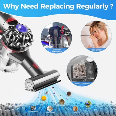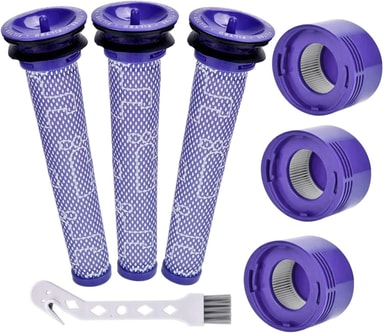 Tilbehørssett med for- og etterfilter som er kompatibelt med Dyson V6/V7/8. Filtrene blokkerer de fleste skadelige partikler og sørger for at støvsugeren din fungerer riktig og optimalt.