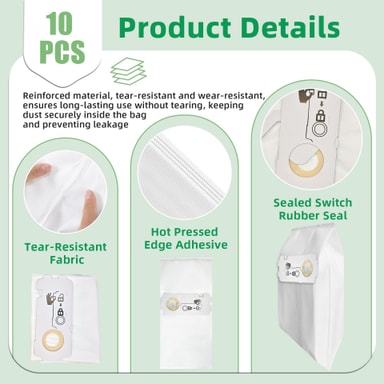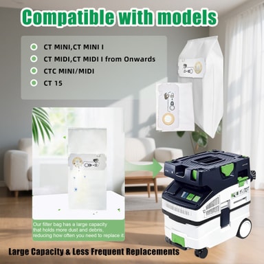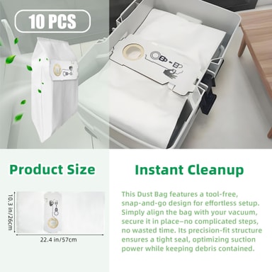 10 stk. støvsugerposer kompatible med FeStool CT15. Laget av ABS og fiberduk, disse 15L erstatningsposene tilbyr effektiv filtrering og enkel utskifting, og fanger opp støv og allergener for et renere hjem.Les mer om produktet