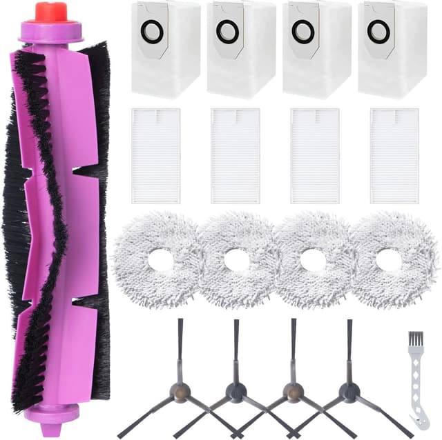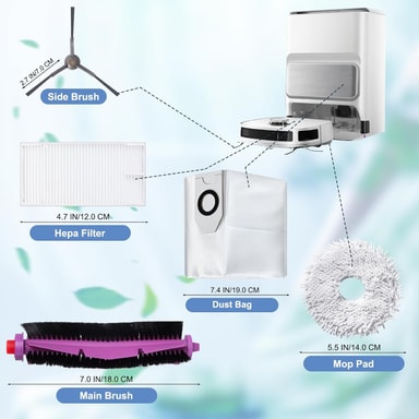 Omfattende rengjøring: Settet inneholder en rekke tilbehør, som hovedbørste, filtre, moppekluter, sidebørster, støvposer og rengjøringsbørste, for å takle forskjellige rengjøringsoppgaver effektivt.