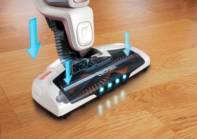 Rullerende børster: Med den nye BRC funksjonen kan du enkelt bruke foten til å trykke på pedalen som er plassert på oversiden av munnstykket. Hår og fibre blir fanget opp i løpet av sekunder og du vil dermed få et meget godt rengjøringsresultat.