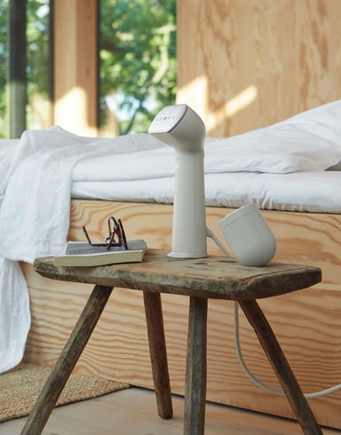 Den kompakte dampstrykeren har en slank silhuett i skandinavisk minimalistisk design. Den har intuitive knapper for enkel betjening. Den kompakte størrelsen gjør apparatet bærbart og ideelt for raske oppfriskninger og reisebruk. Den kan stå oppreist eller legges flatt på bakken for praktisk oppbevaring.