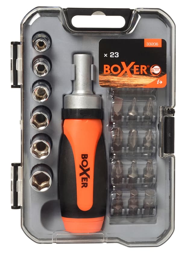 Bitssett med adapter, skrallehåndtak, 6 piper i størrelsene 5-6-7-8-9-10 mm, samt 15 stk. 25 mm CRV-bits: Flatt: 3-4-5-6 mm PH0-1-2-3 PZ1-2 TX-15-20 HEX 4-5-6Les mer om produktet